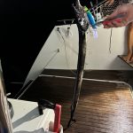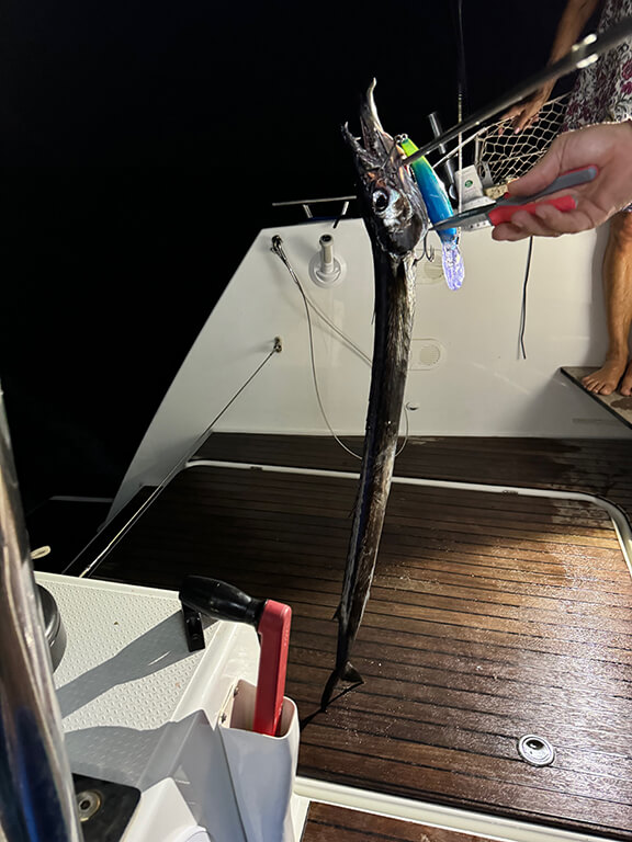Nach dem Abendessen erlebten wir dann ein unerwartetes Highlight: Unsere Angelrute an Backbord meldete plötzlich einen Fang, und die Leine lief mit rasantem Tempo aus. Alle waren sofort in Alarmbereitschaft. Nachdem wir die Leine vorsichtig eingeholt hatten, zeigte sich ein langer, schmaler Fisch mit beeindruckendem, scharfzahnigem Gebiss.