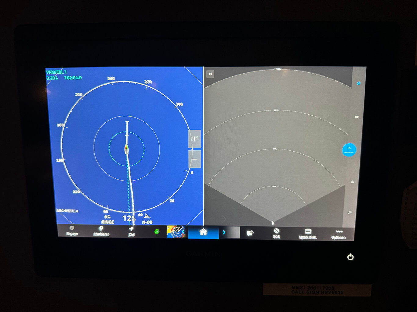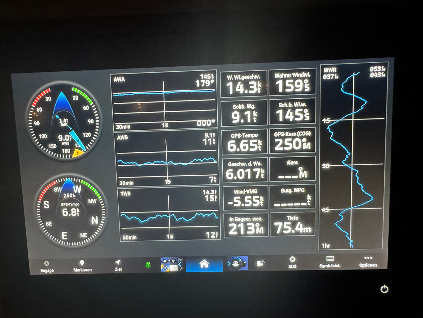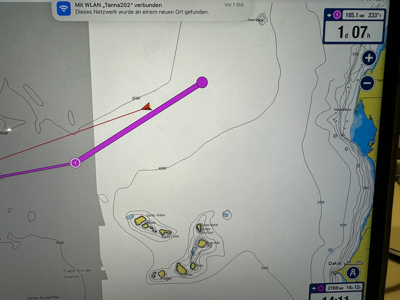 Der Kartenplotter überwacht zudem Schiffe mit AIS (Automatic Identification System). Dieses System sendet unsere Position an andere Schiffe und gibt Warnungen bei möglichen Kollisionen aus. Während wir hier auf dem offenen Meer sind, ist es unwahrscheinlich, auf Schiffe ohne AIS zu treffen. In Küstennähe jedoch sind besonders Fischerboote oft nicht mit AIS ausgestattet, weshalb in solchen Situationen visuelle Wachsamkeit gefragt ist.