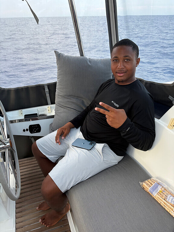 Gemeinsam mit meinem bahamaischen Bootsmann – er fährt normalerweise Ausflugsboote zu den Inseln und gelegentlich auch Motorboote in die USA oder zurück – machten wir uns auf den Weg. Segeln ist er nicht gewohnt, er scheint damit keinerlei Erfahrung zu haben. Doch die Bedingungen sind gut: Tagsüber segeln wir mit dem Gennaker, in der Nacht dann mit Fock und Motor, da der Wind immer mehr nachlässt. Am zweiten Tag herrscht leider nahezu Flaute, sodass wir die gesamte Strecke unter Motor zurücklegen müssen.