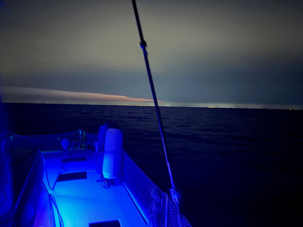 In der Nacht vom 6. Mai 2025, gegen 23 Uhr, durchqueren wir den Kanal bei West Palm Beach und fahren in das dortige Binnenrevier ein. Die Orientierung fällt uns bei all den Lichtern zunächst schwer – was sind Leuchtbojen, die uns den Weg weisen, und was lediglich grüne oder rote Lichter anderer Herkunft? Schließlich finden wir den richtigen Kurs, biegen nach der Einfahrt gleich nach Backbord ab und ankern vorerst provisorisch im West Basin, um am nächsten Morgen eine Marina zu suchen.