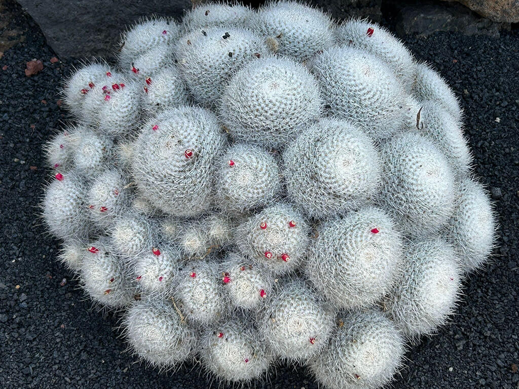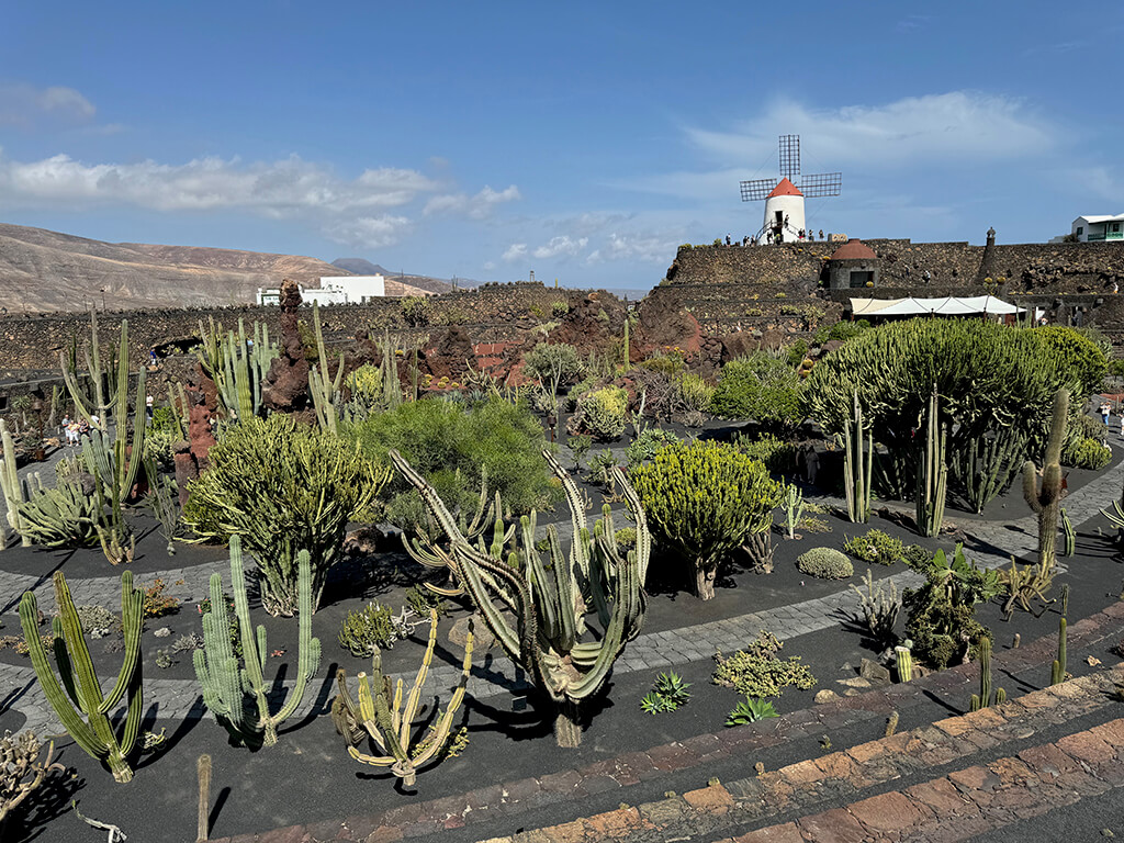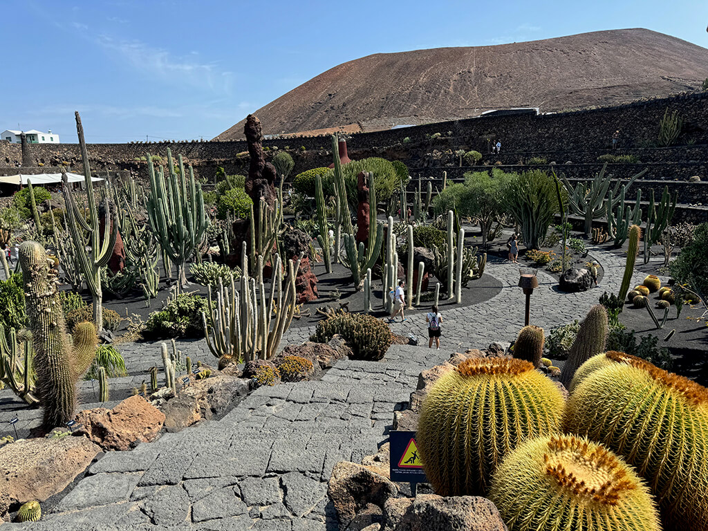 Ein weiteres faszinierendes Werk von César Manrique, das wir besichtigten, war sein berühmter Kaktusgarten in Guatiza. Dieses aussergewöhnliche Kunstwerk der Gartenarchitektur wurde in einem ehemaligen Steinbruch angelegt und zeigt eindrucksvoll, wie Natur und Kunst harmonisch miteinander verschmelzen können. Der Garten beherbergt eine beeindruckende Sammlung von über 1.400 verschiedenen Kakteenarten aus der ganzen Welt, die in sorgfältig gestalteten Arrangements präsentiert werden. Die Kombination aus den schroffen schwarzen Lavasteinen, dem satten Grün der Kakteen und den leuchtenden Blütenfarben schafft eine einzigartige, beinahe surreal anmutende Atmosphäre.