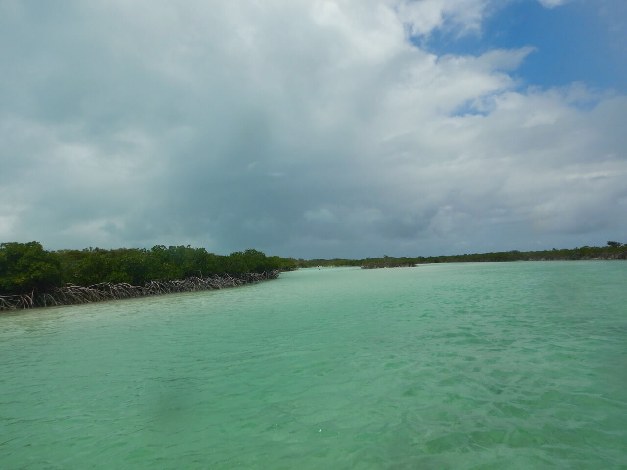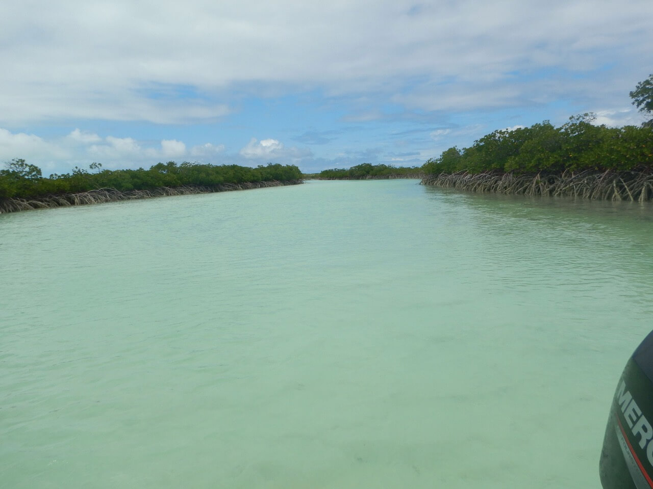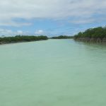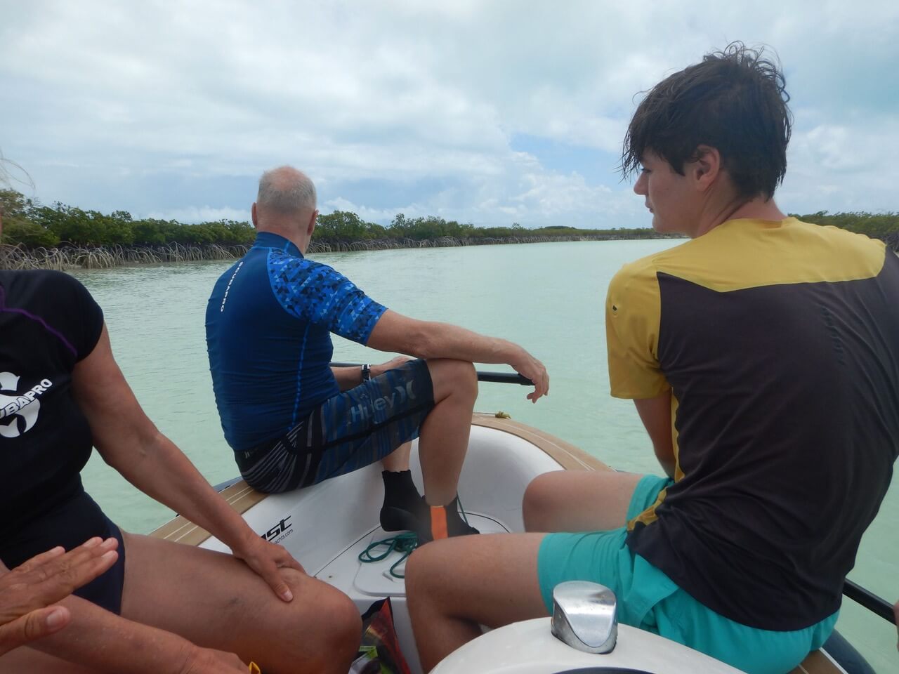 Shroud Cay ist eine unbewohnte Inselgruppe im nördlichen Teil des Nationalparks, bestehend aus Mangrovensümpfen, flachen Lagunen und hellen Sandbänken. Nach einem ausgiebigen Frühstück machen wir uns zu fünft im Dingi auf, um den Shroud Creek zu erkunden – ein natürlicher Kanal, der sich wie ein Fluss durch die Insel schlängelt.