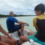 Wir hätten wohl besser auf das Rührei verzichtet – bei beginnender Ebbe starten wir etwas unbedacht ins Abenteuer. Der Einstieg beginnt vielversprechend in einer glasklaren, türkisfarbenen Lagune. Doch schon bald sehen wir, wie die Mangrovenwurzeln hoch in der Luft hängen – ein deutliches Zeichen für Niedrigwasser.