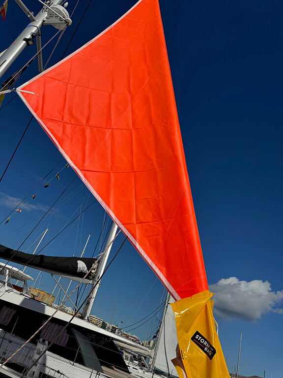 Ein weiteres neues Ausrüstungsteil, das wir an Bord nehmen, ist eine Sturmfock. Diese testen wir vor der Abfahrt, in der Hoffnung, dass wir sie auf der Reise nicht einsetzen müssen.