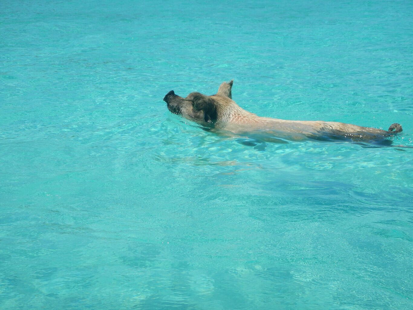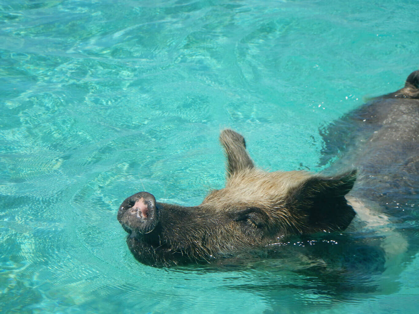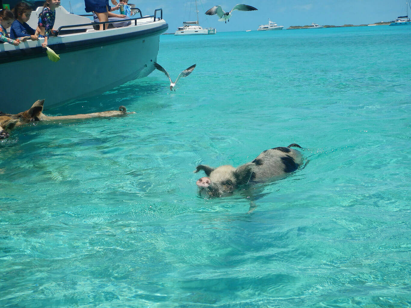Schon von Weitem ist klar: Hier ist etwas los. Ausflugsboote voll Tourist:innen kommen auf Tagestour von Nassau. Und tatsächlich – wir trauen unseren Augen kaum: Die Schweine schwimmen im „Hundeschwumm“ auf die Boote zu und lassen sich bereitwillig füttern. Einige Besucher:innen springen mutig ins Wasser und planschen gemeinsam mit den Tieren, während sich am Strand Bikini-Schönheiten für das perfekte Foto mit ihren neuen Freunden in Szene setzen.