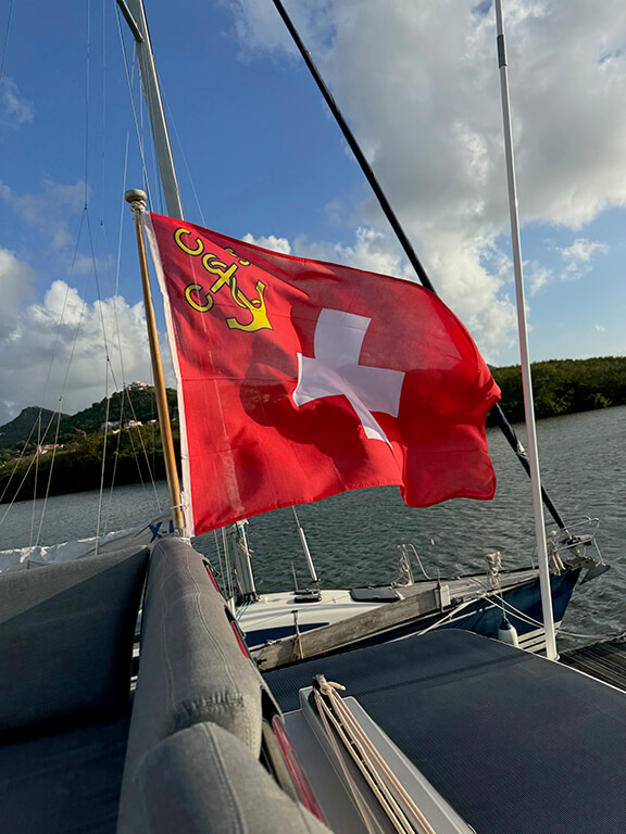 Ich habe eine neue Fahne mitgebracht – frisch aus der Schweiz, mit dem Logo des CCS (Cruising Club der Schweiz). Sie wurde gleich gehisst und zeigt nun noch deutlicher, wo das Schiff immatrikuliert ist.